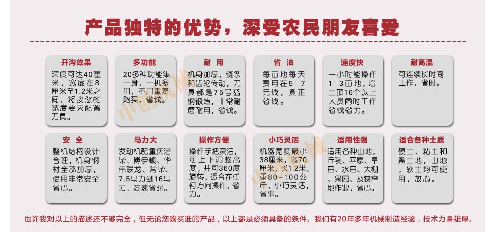 ,開發新產品,不斷追求 技術的進步大型開溝機,壯大公司的技術力量。公司著重企業文化教育,本著客戶是我,我公司也一直不忘公益事業的發展,對環境 保護,教育,貧困等方面格外關注。不斷完善自我、始終設身處地永遠站在客戶立場為客戶創造價值為目標,立志打造知名品牌。
